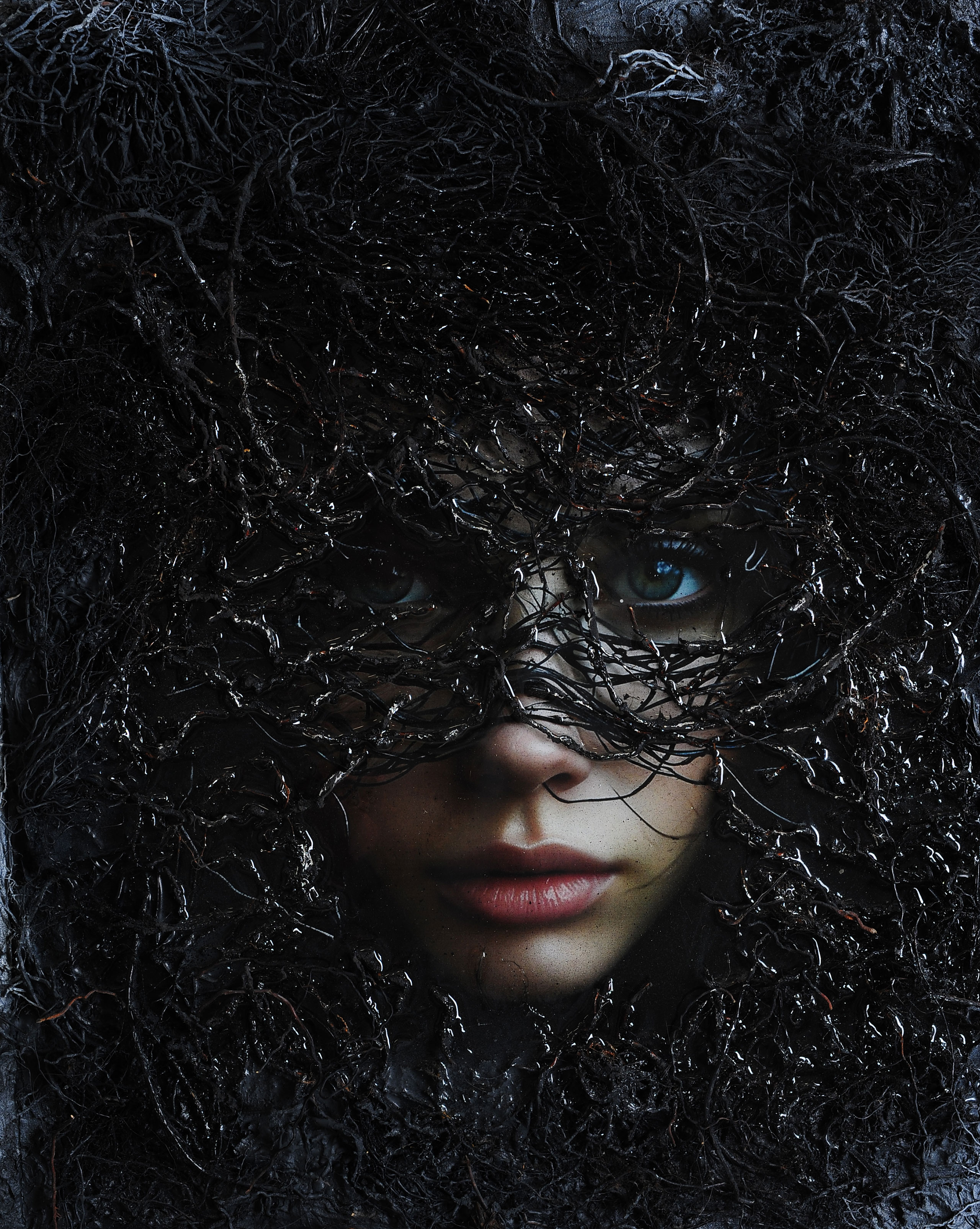 На картине лицо девушки возникает из лесной тени, будто древний дух, проснувшийся среди ветвей. Она не просто часть природы — она сама природа, дышащая сквозь кору и тишину. Ветки сплетаются с её чертами, как мысли с чувствами, как память с настоящим. Картина говорит о том, что существует глубина, невидимая глазу — в лесу, в человеке, в самом времени. Это приглашение замедлиться, замолчать, и услышать то, что давно забыто.