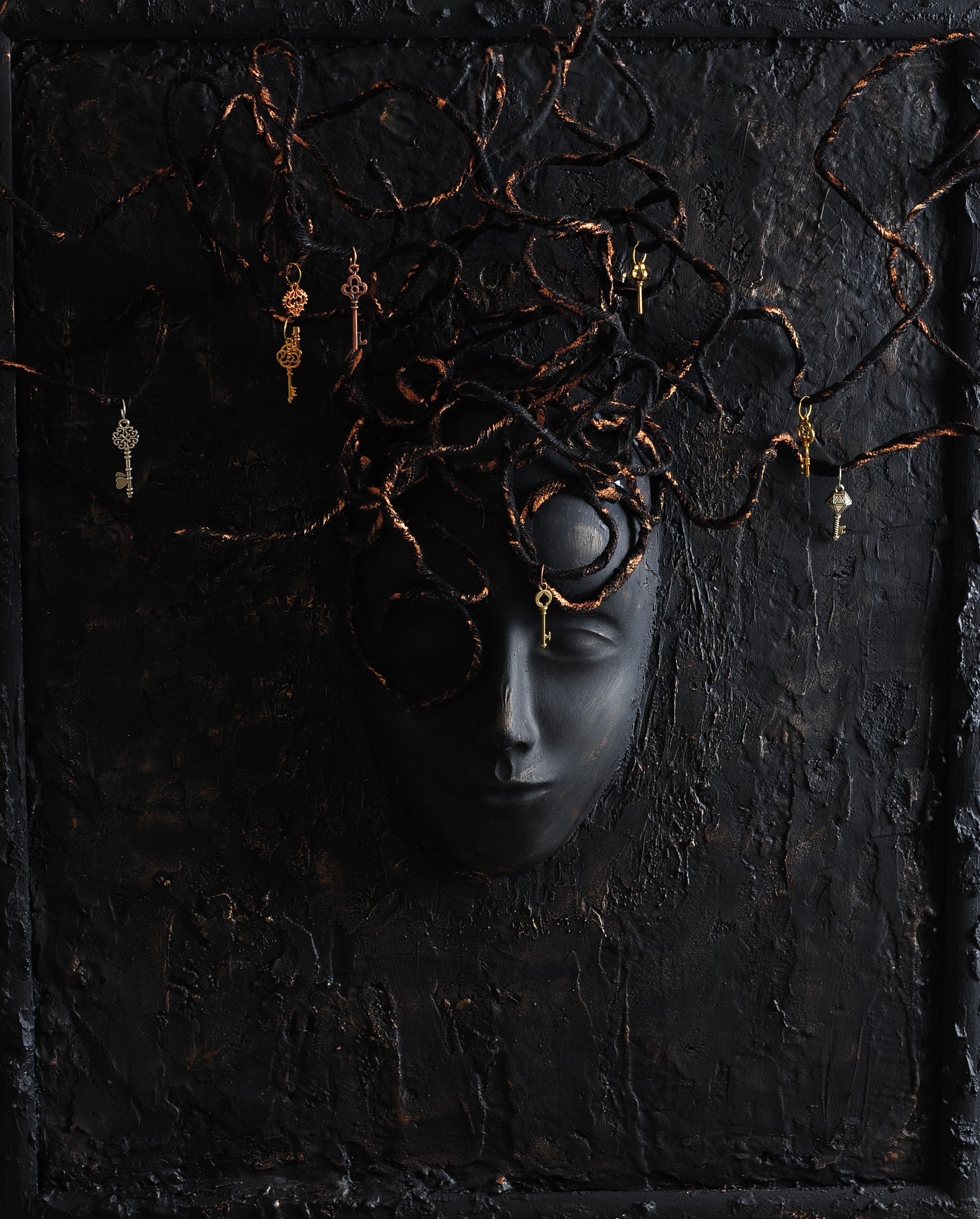 Её лицо спокойно, скрыто в глубине теней, но из разума извиваются тонкие прутья, словно ветви древа познания. На некоторых весят ключи они разные. Они не разбросаны хаотично, не подвешены в пустоте — они рождаются из неё самой. Мысли, чувства, озарения превращаются в возможности, решения, истины.